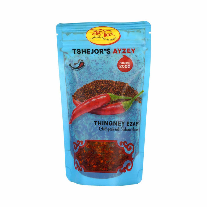 Discover the authentic taste of Bhutan with Tshejor's Ayzey Thingney Ezay, a premium chilli paste infused with the unique and bold flavor of Sichuan pepper. Perfect for those who love a fiery kick in their meals, this ezay offers a delightful combination of heat and aromatic spices, making it a must-have condiment in every kitchen.