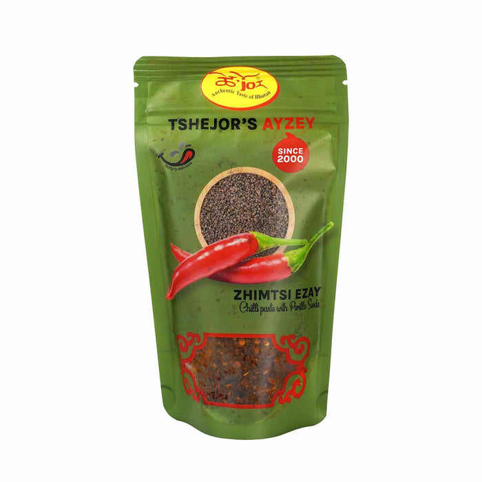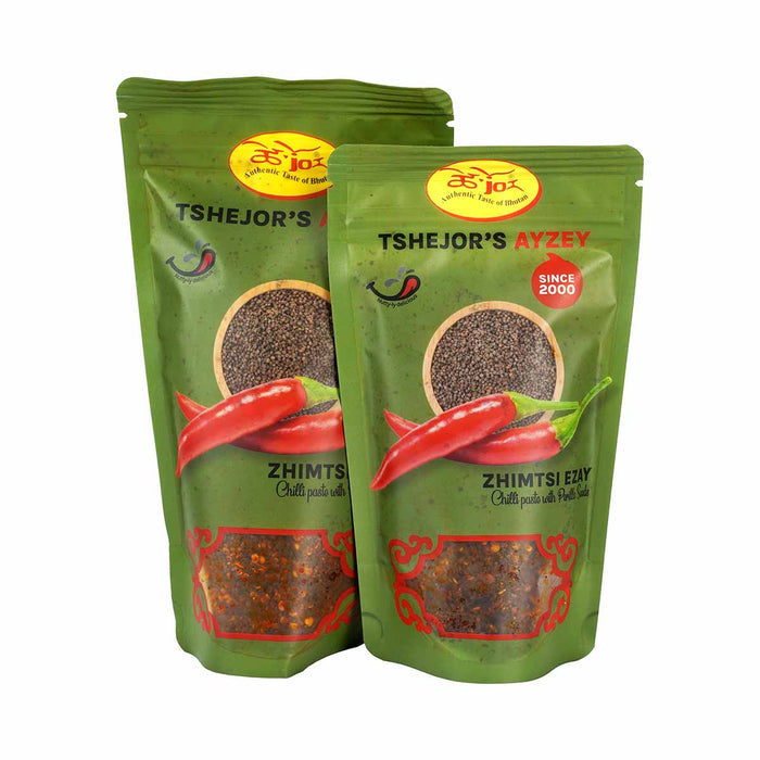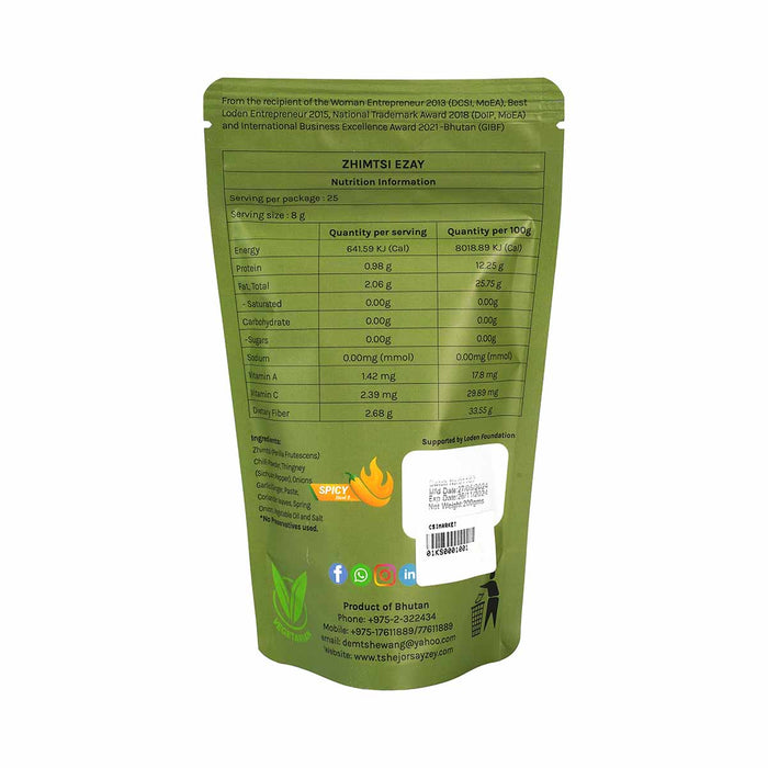 Experience the authentic taste of Bhutan with Tshejor's Zhimtsi Ezay, a traditional spicy condiment crafted by an award-winning woman entrepreneur. This flavorful blend combines the fiery heat of Zhimtsi (Piper Frutescens) with a carefully selected mix of chili, garlic, Sichuan pepper, onions, and aromatic spices.